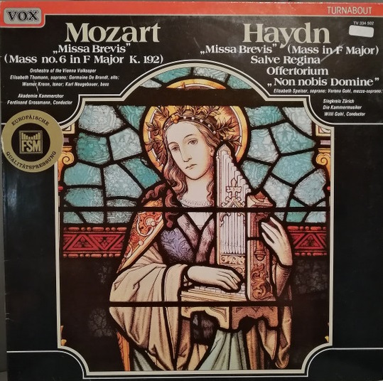 | Další informace: | Wiener Akademie Kammerchor, Singkreis Zürich. Mozart: Mass No. 6 in F Major, K. 192 "Missa Brevis" A1 Kyrie 4:25 A2 Gloria 5:07 A3 Credo 7:43 A4 Sanctus 1:35 A5 Banedictus 2:07 A6 Agnus Dei 4:15 Haydn: Mass in F Major (Missa Brevis) for 2 sopranos, choir, strings and organ B1 Kyrie 1:31 B2 Laudamus te (Gloria) 1:44 B3 Patrem omnipotentem 3:35 B4 Sanctus 1:10 B5 Benedictus 3:22 B6 Agnus Dei 2:52 |