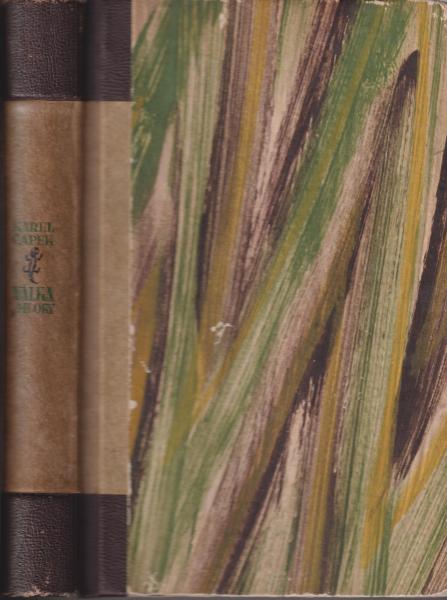 | Další informace: | Polokožená a pergamenová, umělecká vazba s vevázanou obálkou, 273 stran. Obálky a typografie: Zdenek Seydl. Vědecko-fantastický román o historii náhodně objeveného druhu učenlivých mloků, které se podnikatelům a finančníkům podaří přizpůsobit hospodářským potřebám, kteří si osvojí lidskou řeč a společenský život, podle buržoazních vzorů si vytvoří podmořskou říši, převezmou fašistickou ideologii a její válečné cíle, vyhlásí heslo „čistého Mloctví“ a dají nakonec lidstvu ultimátum s požadavkem „životního prostoru“. |