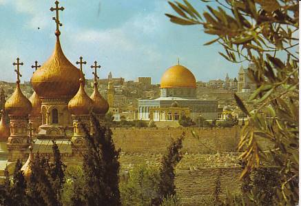 JERUSALEM, THE CHURCH OF ST.MARY MAGDALENE AND THE DOME OF THE ROCK, SEEN FROM THE MOUNTAIN OF OLIVES / IZRAEL /