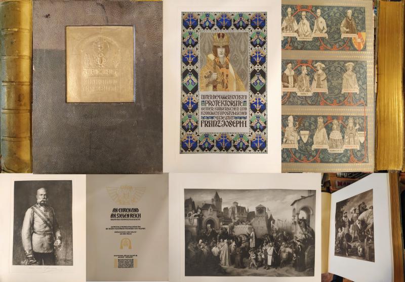Další informace: | Bilder aus Österreichs Geschichte. Unter der literarischen Leitung von Joseph Alexander von Helfert. Hrsg.u.verlegt von Max Herzig. Redakteur für die Bilder, Josef Dernjac. Buchschmuck von Heinrich Lefler, Joseph Urban, J.J. Tautenhayn, Ludwig Huyier, Rud.Edl.von Larisch. Celokožená pevná vazba se zlatým slepotiskem vsazeným do desek - císařská koruna v reliéfu, spodní roh hřbetu je trochu naražený, rozměr 49,5 x 38 cm. Pouze 220 stran! Frontispis mědirytina, 40 světlotisků (poslední chybí) a 2 barevné litografie. Kompletní zlatá ořízka, spona na uzavření desek chybí. Knižní výzdoba Heinrich Lefler, Josef Urban, Joh. Jos. Tautenhayn, Ludwig Hujer, Rud. Edl. von Larisch, pod nejvyšším protektorátem Jeho Královského Apoštolského Veličenstva Františka Josefa I. |