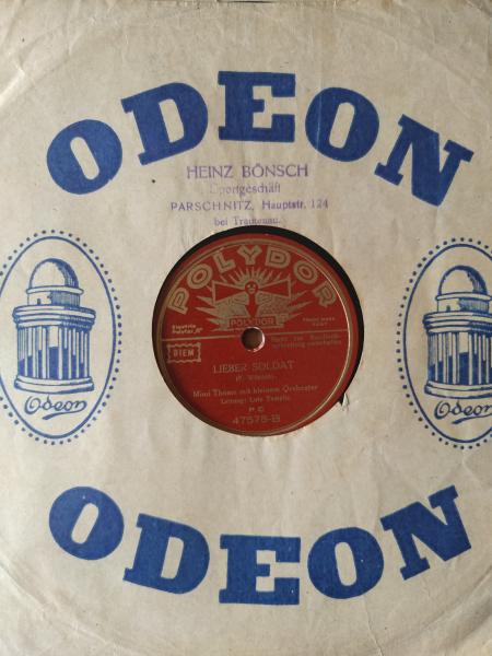 | Další informace: | Šelaková deska. Shellac, 10", 78 RPM. A Lied Eines Jungen Wachtpostens (Lili Marleen) Lyrics By – Hans Leip Music By – Norbert Schultze B Lieber Soldat Written-By – F. Wilczek* Conductor – Lutz Templin Engineer [Uncredited] – Oskar Blaesche Sr. Orchestra [Uncredited] – Lutz Templin Und Sein Tanzorchester Vocals – Mimi Thoma |