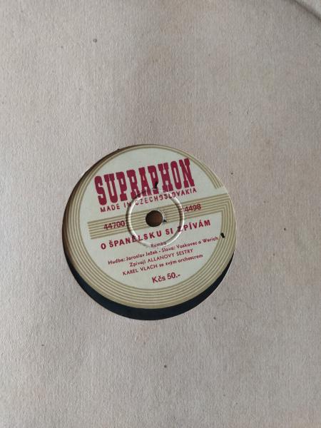 | Další informace: | Šelaková deska. Uštípnutý kousek kraje desky. Shellac, 10", 78 RPM. Byla jedna holčička / O španělsku si zpívám. |