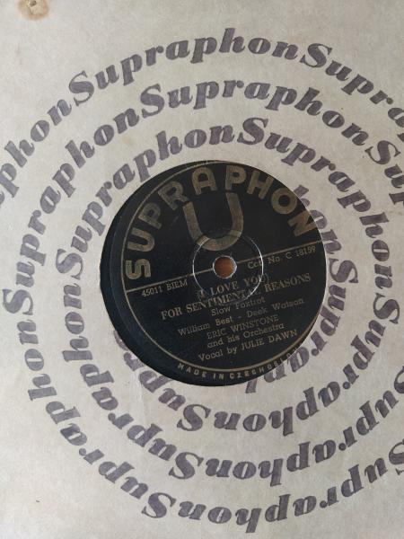 | Další informace: | Šelaková deska. Shellac, 10", 78 RPM. A (I Love You) For Sentimental Reasons Written By – William Best Written-By – Deek Watson B Eager Beaver Written-By – Stan Kenton Orchestra – Eric Winstone & His Orchestra Vocals – Julie Dawn (tracks: A) |