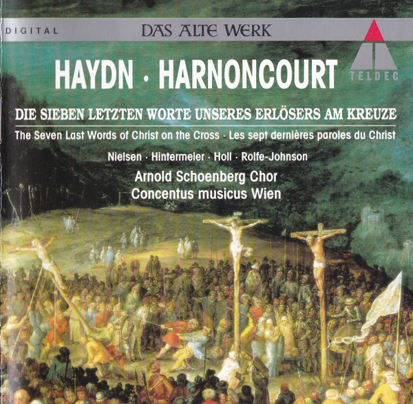 | Další informace: | CD. Nielsen• · Hintermeier · Holl · Rolfe-Johnson · Arnold Schoenberg Chor · Concentus Musicus Wien · Harnoncourt. Die Sieben Letzten Worte Unseres Erlösers Am Kreuze, Hob. XX:2 (Vocal Version) 1 Introduzione 5:29 2 No. 1 »Vater, Vergib Ihnen« 7:38 3 No. 2 »Fürwahr, Ich Sag Es Dir« 7:00 4 No. 3 »Frau, Hier Siehe Deinen Sohn« 8:07 5 No. 4 »Mein Gott, Mein Gott« 6:28 6 Introduzione 4:04 7 No. 5 »Jesus Rufet« 7:54 8 No. 6 »Es Ist Vollbracht« 7:08 9 No. 7 »Vater, In Deine Hände« 6:36 10 Terremoto »Er Ist Nicht Mehr« 1:50. Bass Vocals – Robert Holl Bassoon – Milan Turkovic, Trudy Van Der Wulp Cello – Dorothea Guschlbauer, Herwig Tachezi Choir – Arnold Schoenberg Chor Chorus Master – Erwin Ortner Clarinet – Hans R. Stalder*, Pierre A. Taillard* Composed By – Joseph Haydn Conductor – Nikolaus Harnoncourt Contrabassoon – Henk De Witt Contralto Vocals – Margareta Hintermeier Cover – Antonio Campi Edited By [Digital Editing] – Uta Schwiemann Engineer [Assistant] – Stefan Witzel Engineer [Recording] – Eberhard Sengspiel*, Michael Brammann Executive-Producer – Renate Kupfer, Wolfgang Mohr Horn [Naturhorn] – Alois Schlor, Hector McDonald Liner Notes – Hartmut Krones Liner Notes [English Translation Of The Text] – Gery Bramall Liner Notes [English Translation] – Gery Bramall Liner Notes [French Translation Of The Text] – Christian Hinzelin Liner Notes [French Translation] – Christian Hinzelin Oboe – Marie Wolf, Omar Zoboli Orchestra – Concentus Musicus Wien Organ – Herbert Tachezi Producer [Recording] – Helmut Mühle Soprano Vocals [❘] – Inga Nielsen Soprano Vocals [❘❘] – Renate Burtscher Tenor Vocals – Anthony Rolfe-Johnson* Timpani – Michael Vladar Trombone – Ernst Hoffmann (2), Josef Ritt Trumpet [Naturtrompete] – Edward Cervenka (2), William Nutty Viola – Johannes Flieder, Kurt Theiner, Lila Brown, Lynn Pascher Violin – Alice Harnoncourt, Andrea Bischof, Anita Mitterer, Barbara Klebel, Christian Schneck, Erich Höbarth, Gerold Klaus, Helmut Mitter, Karl Höffinger, Maighread McCrann, Maria Kubizek, Peter Katt, Peter Schoberwalter, Peter Schoberwalter Jun., Thomas Fheodoroff Violone – Andrew Ackerman, Eduard Hruza |