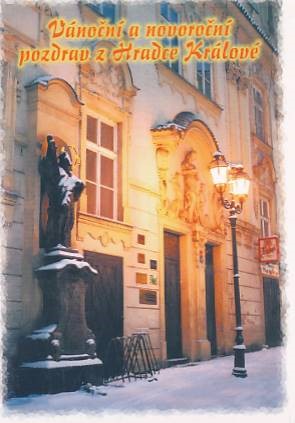 VÁNOČNÍ A NOVOROČNÍ POZDRAV Z HRADCE KRÁLOVÉ, PSEUDOBAROKNÍ PRŮČELÍ BÝVALÉ ZÁLOŽNY NA NÁMĚSTÍ V KOPEČKU, V POPŘEDÍ SOCHA SV.JANA NEPOMUCKÉHO