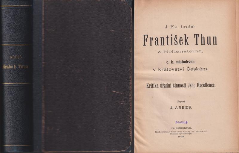| Další informace: | Komplet 3 díly v jedné poloplátěné vazbě, 256 + 272 + 638 stran. Výborný stav. „J. Ex. hrabě František Thun z Hohenšteina, c. k. místodržící v království Českém“ je politicko-kritické dílo českého spisovatele a novináře Jakuba Arbese. V této práci (vydávané kolem roku 1895) Arbes podrobil kritice úřední činnost tehdejšího českého místodržícího, Františka Thun-Hohensteina. |
