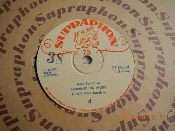 | Další informace: | A Hurvínek Na Výletě 3:00 B Hurvínek Na Výletě, Voice Actor [Hovoří] – Miloš Kirschner Written-By – Josef Barchánek, Shellac, 10", 78 RPM, Mono |