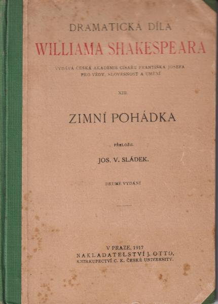 | Další informace: | Poloplátěná pevná vazba, 157 stran. Přeložil J. V. Sládek. Zimní pohádky skutečná rodinná tragédie mazovského knížete Ziemowita, který dal ze žárlivosti uvěznit svou mladou ženu a poslal na smrt synka, kterého porodila ve vězení. Kněžna zemřela, ale kajícný manžel se po letech setká se zachráněným synem. Příběh do Anglie pravděpodobně přivezla dcera Karla IV. Anna, jejíž sňatek s králem Richardem II. dojednal synovec knížete Ziemowita. Přímým pramenem, z něhož Shakespeare čerpal, je povídka Roberta Greena "Pandosto aneb Vítězství" (1588), která rozpracovává zmíněný příběh mazovského knížete. Změnil jména, některé postavy oželel, jiné upravil, další připsal (např. Paulinu), čímž se mu z rozvleklého, drsně dobrodružného vyprávění podařilo vytvořit skvělé drama. |