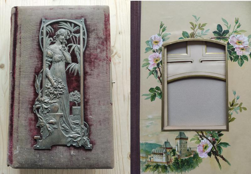 | Další informace: | Celoplátěné fotoalbum na kabinetky se secesním kovovým ornamentem, rozměr 33 x 21 cm. 15 listů s výřezy na 70 kabinetek, zlatá ořízka, velmi dobrý stav, uvnitř nepotrháno. Chybí přední část zavírací kovové spony. |