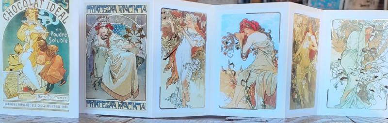| Další informace: | Rozkladací leporelo, úplně nové, 12 zlacených obrázků Alfonse Mucha, rozměr 9,5x6,5 cm. |