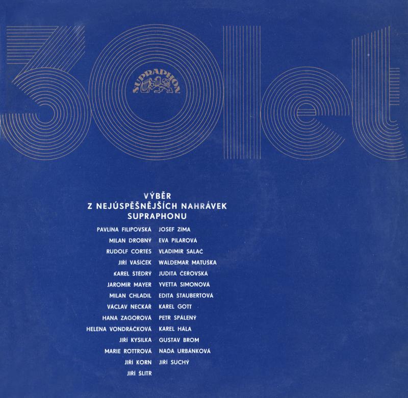 | Další informace: | Výběr z nejúspěšnějších nahrávek supraphonu. A1 –Pavlína Filipovská, Josef Zíma Nej, Nej, Nej... A2 –Milan Drobný Písnička Pro Kočku A3 –Eva Pilarová, Waldemar Matuška Ach, Ta Láska Nebeská A4 –Rudolf Cortés Váš Dům Šel Spát A5 –Vladimír Salač Píseň Pro Kristýnku A6 –Jiří Vašíček Tenkrát A7 –Pavlína Filipovská Včera Neděla Byla A8 –Waldemar Matuška A Karel Štědrý Mám Malý Stan A9 –Judita Čeřovská Je Po Dešti A10 –Josef Zíma A Jaromír Mayer Si, Si, Si Signorina A11 –Yvetta Simonová A Milan Chladil O Nás Dvou A12 –Olympic (2) Dynamit A13 –Edita Štaubertová Babičko, Nauč Mě Charleston A14 –Milan Chladil Jipi Jou A15 –Václav Neckář Svět Je Místo K Radování B1 –Karel Gott Lady Carneval B2 –Hana Zagorová Bludička Julie B3 –Petr Spálený Plakalo Bejby B4 –Helena Vondráčková Mám Ráda Cestu Lesní B5 –Waldemar Matuška Sedm Dostavníků B6 –Josef Zíma Blues Pro Tebe B7 –Karel Gott, Karel Hála A Jiří Kysilka Dívka Toulavá B8 –Gustav Brom Pozdrav Astronautovi B9 –Karel Hála Lodí Bílou B10 –Marie Rottrová Lásko B11 –Karel Gott C'est La Vie B12 –Naďa Urbánková Gondola B13 –Jiří Korn Yvetta B14 –Eva Pilarová Rodeo B15 –Jiří Suchý & Jiří Šlitr Babetta Backing Vocals – Sbor Lubomíra Pánka* (tracks: A1, A6, A14, A15, B9, B12), Sbor Divadla Semafor (tracks: A2), Kvinteto Divadla Semafor* (tracks: A3) Band – Apollobeat, Plameňáci*, Olympic (2) Conductor – J. Vobruba* Cover – Jitka Špačková Engineer [Zvuková Režie] – Jan Chalupský Orchestra – Taneční Orchestr Čs. Rozhlasu*, Orchester F. Havlíka*, Orchestr G. Broma*, Orchestr K. Vacha*, Orchestr Divadla Semafor, Orchestr J. Spáleného*, Orchetstr Polydoru* Recording Supervisor [Hudební Režie] – Mojmír Balling Technician [Technická Spolupráce] – Jiří Rohan |