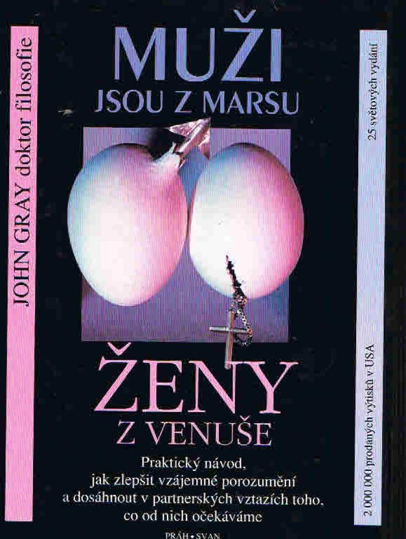 | Další informace: | Brožovaná, 203 stran, dobrý stav.Kdysi za pradávných časů se Marťané a Venušanky setkali, zamilovali se do sebe a navázali šťastné vztahy, protože uznávali a respektovali vzájemné rozdíly. Potom však přišli na Zem a stihla je ztráta paměti: zapomněli, že pocházejí z různých planet. Touto metaforou vysvětluje Dr. John Gray běžné konflikty mezi muži a ženami a ukazuje, jak se odlišnost mezi pohlavími může projevovat a bránit navázání uspokojivých milostných vztatů. Na základě své mnohaleté zkušenosti úspěšného poradce párů i jednotlivců radí, jak neutralizovat rozdíly ve stylu komunikace, citových potřebách a způsobech chování a dostáhnout tak většího porozumění mezi partnery. Kniha Muži jsou z Marsu, ženy z Venuše je nedocenitelený návod k vytvoření hlubších a uspokojivých vztahů |