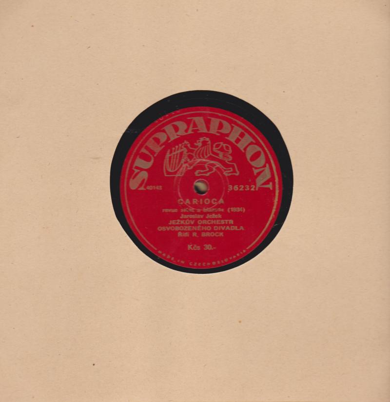 | Další informace: | Šelaková deska, 78. Shellac, 10", Mono, 78 RPM.Ježkův Orchestr Osvobozeného Divadla. A Carioca Conductor [Řídí] – Robert Brock Orchestra – Ježkův Orchestr Osvobozeného Divadla* 3:40 AA Svítá Conductor [Řídí] – Jaroslav Ježek Orchestra – Orchestr Jaroslava Ježka* 3:45 Credits Music By – Jaroslav Ježek Notes [A] Z revue „Kat a blázen‟ (1934) [AA] Foxtrot |